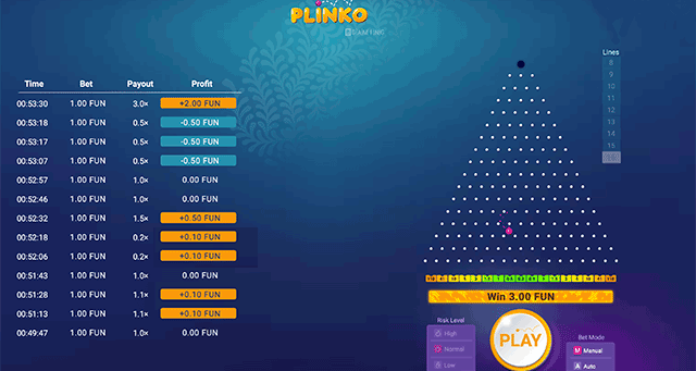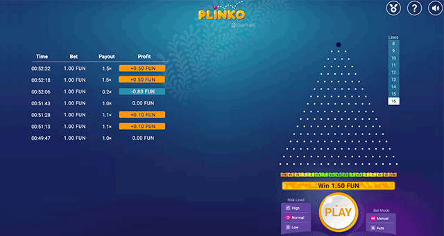 The game is a great choice when you want mindless entertainment with fast-paced action. Plinko is similar to a Japanese game called Pachinko. It doesn't have many details in terms of graphics, which is part of its charm. The game feels as light as it looks when playing. Once you click on 'Play,' you can watch the ball bounce around the rows of pins and land in a box. The slot lets you pick different variance levels - low, medium or high. Your preferred variance determines the number of pins, which can be anything, from 8 to 16. The more the number of pins, the higher the payout.